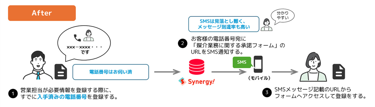 このサービス導入により、「媒介業務に関する承諾フォーム」の案内をメールアドレス宛だけではなく、電話番号(SMS)で連絡するフローも追加しました 。営業メンバーは、お客様の電話番号さえお伺い出来ていれば、メールアドレスを改めてお伺いすることなく、すぐに承諾フォームへのご案内とお手続きを可能とする業務改善を実現しました。