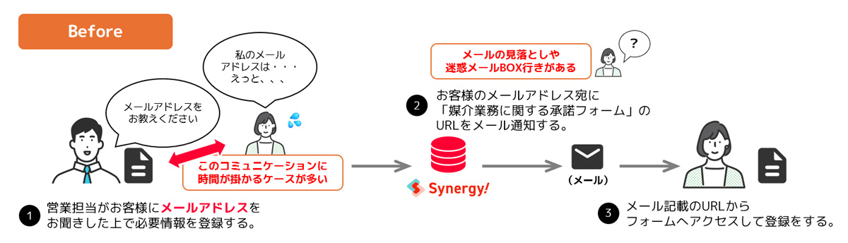 - メールアドレスが分からないケースが多い:営業が入力するタイミングで、お客様のメールアドレスが確認できないため、確認作業が発生していました 。