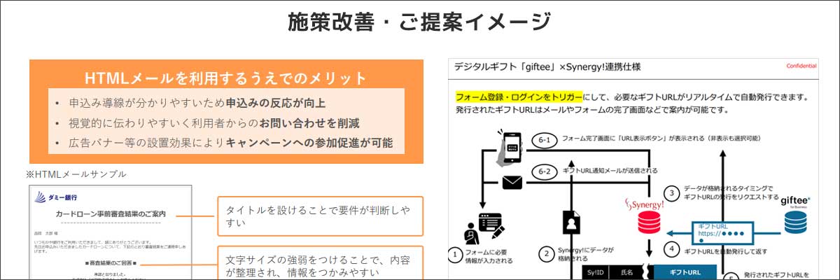 本サービスでは、分析だけで終わりにはしません。現状のボトルネックを明らかにしたうえで、弊社ツール「Synergy!」を活用したHTMLメール配信やキャンペーン施策、Web広告など、具体的な解決策までセットで実行を支援します。