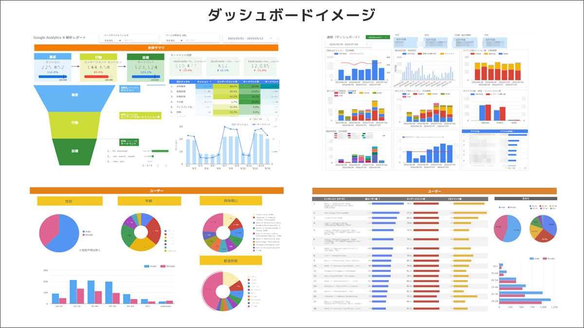 お客様のWebサイトやGA4環境を確認・調査の上、必要な設定があれば対応の上、追うべき指標(KPI)を絞り込み、施策の良し悪しが一目で分かるダッシュボードを作成します。